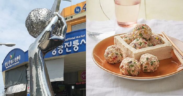 Джумокбап и памятник этой еде на рынке Яндонг в Кванджу.