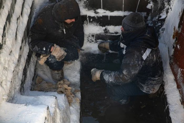 Ближе к весне в Якутии, по здешним меркам, теплеет: столбик термометра редко опускается ниже 30-градусной отметки. Горожане вздыхают с облегчением, а для выморозчиков наступают тяжелые времена. Чем теплее, тем медленнее промерзает лед, труднее останавливать течи. Бригады привозят на коротеньких санках вентиляторы, монтируют их на ночь у майн: гонят холодный воздух, чтобы ускорить заморозку».