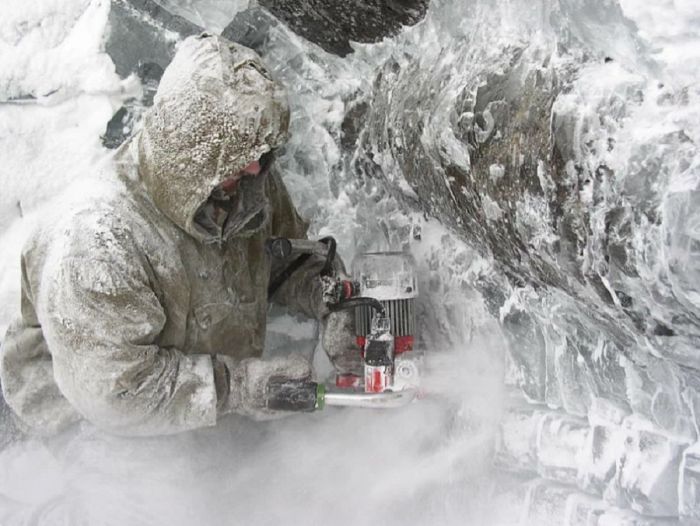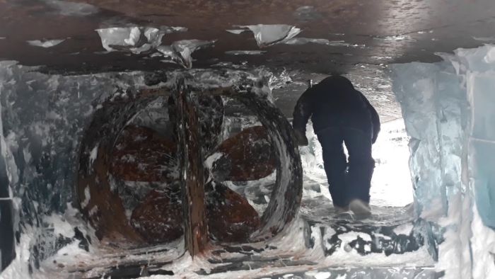 Задача нашей работы состоит в том, чтобы пробраться до винтов корабля. Для этого необходимо удаляться под реку на три с лишним метра. А лед может промерзнуть только на 50 сантиметров, остальное-вода! Чтобы полностью сделать свою работу, нам приходится выбивать сначала один кусок, потом ждать, когда река снова заледенеет ниже, а потом мы продолжаем долбить и это место.