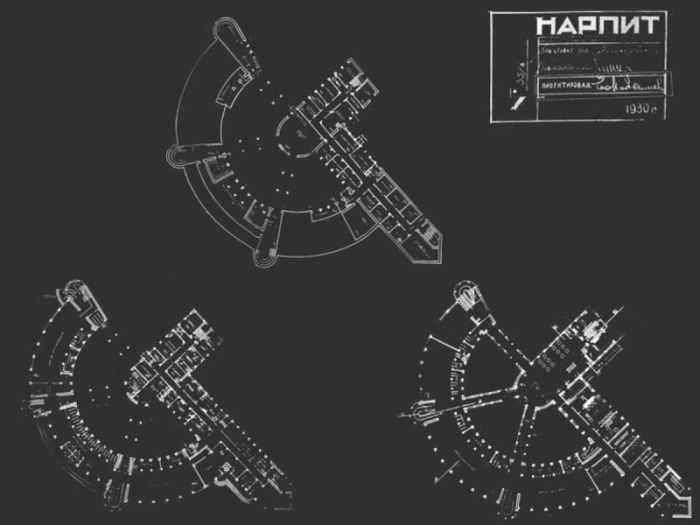 Так "серп" был предназначен для посетителей: на первом этаже – гардероб и вестибюль, а на втором – обеденные залы. Кроме того, были предусмотрены и помещения с отдельными входами с улицы – для детского зала, зала диетического питания, а также магазина, парикмахерской и почты.