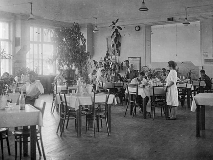 Обеденный зал в здании фабрики-кухни завода им. Масленникова, 1930-е годы