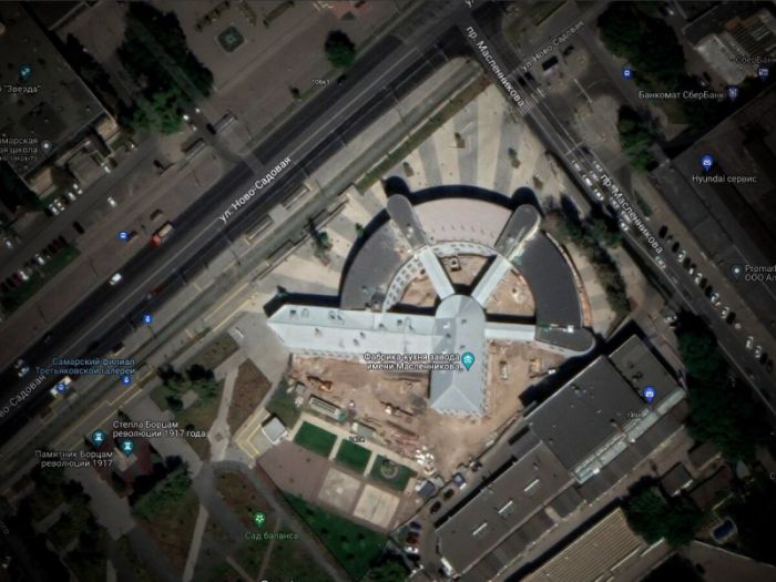 Вид сверху за здание в виде "Серпа и молота" в Самаре