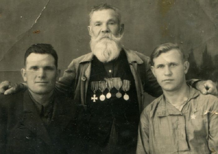 По сторонам: Герой Советского Союза Ф. Н. Купин, А. И. Купин, в центре Георгиевский кавалер Андрей Исидорович Криковцов