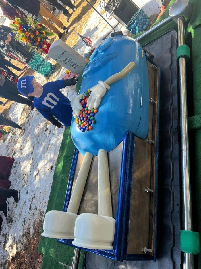 Перед смертью Мэри Мартин изъявила желание, чтобы семья похоронила ее в огромной конфете M&M’s. Она сама разработала дизайн гроба в стиле любимых конфет, а один из ее сыновей изготовил его. На гробу изображена огромный персонаж M&M’s синего цвета. Его глаза закрыты, а руки сложены на животе. Под руками у персонажа множество разноцветных конфет M&M’s, на каждой из которых написаны имен шести детей и 57 внуков умершей. Гроб много лет стоял в доме женщины, прежде чем семье пришлось воспользоваться им для ее похорон.