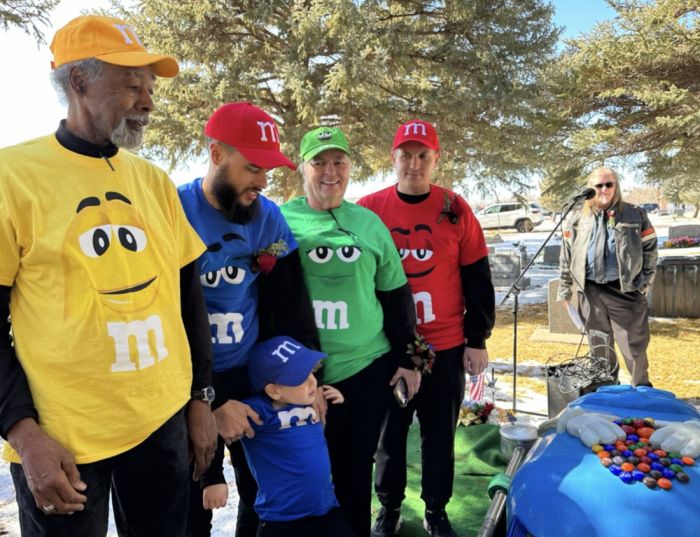 На траурном мероприятии вся семья была одета в разные футболки и шапки с персонажами M&M’s.