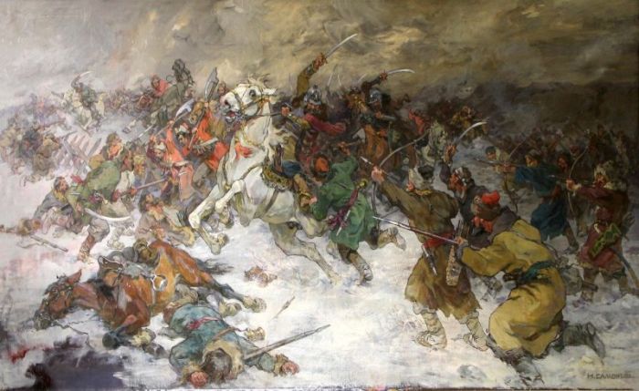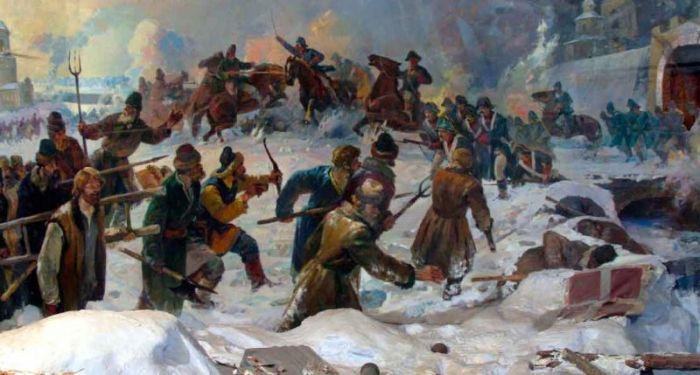 Бой разинцев с правительственными войсками. Н. С. Самокиш. 1937 год Как и положено предводительницу восставших пытали каленым железом и дыбой, чтобы получить раскаяние, но не добились в этом деле никаких успехов. Алена постоянно молилась, прерываясь лишь затем, чтобы плюнуть в своих мучителей. Короткое расследование показало, что кроме бунта за беглой монахиней были и другие грехи, в частности, врачевание плесенью. Это дало отличный повод объявить Алену не только мятежницей, но и ведьмой и приговорить к сожжению. В XVII веке в России редко жгли колдунов у столба — для этого использовали более сложный метод.