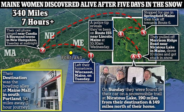 51-летняя Кимберли Пушард и 50-летняя Анджела Басселл, имеющие интеллектуальные нарушения, ехали в торговый центр в город Саут-Портленд, чтобы поиграть в боулинг. Пытаясь добраться до торгового центра, который находится в часе езды от их города, они по ошибке свернули в штат Массачусетс.