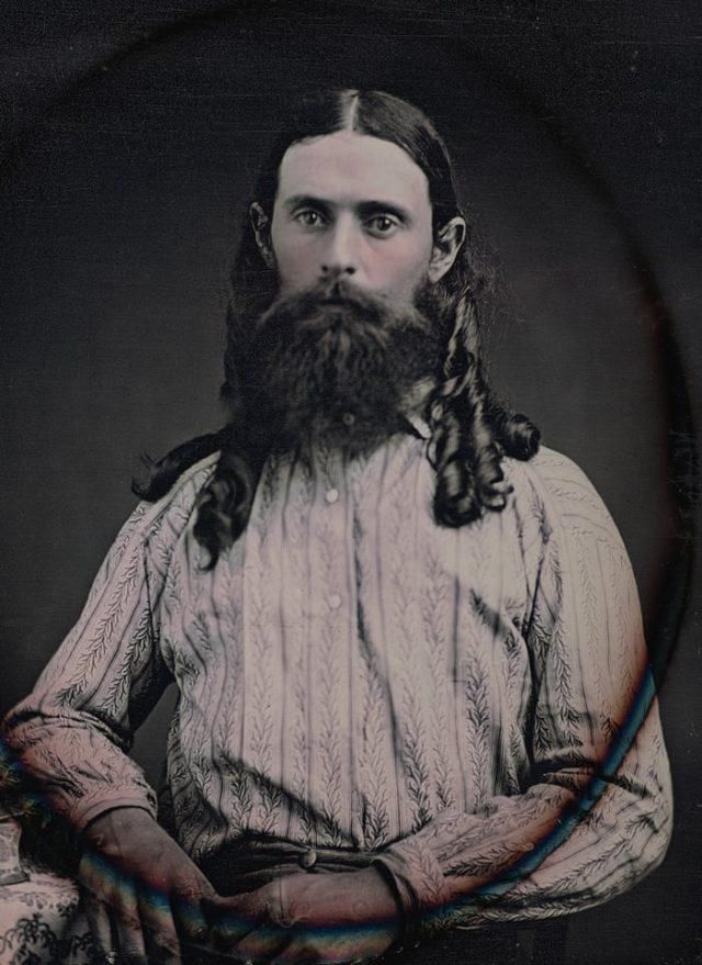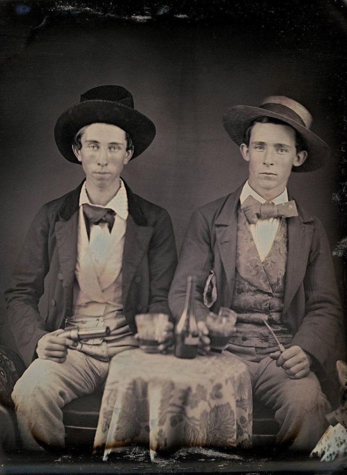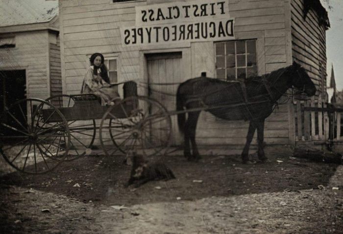 К слову, это не совсем фотографии (по крайней мере, не в строгом смысле). Перед нами дагерротипы. Дагерротипия — архаичная форма запечатления изображения, процесс, основанный на светочувствительности йодистого серебра. Такой способ использовался в течение пары десятилетий в XIX веке, но был вытеснен более современными методами. Поверхность дагерротипа состоит из амальгамы, образующейся при взаимодействии серебра и ртути, поэтому такой способ нередко называли «зеркалом с памятью». Романтическая технология для романтичных времен: