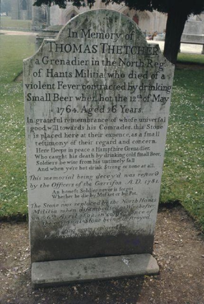 На кладбище Винчестерского собора есть могила, украшенная надписью: «В память о Томасе Тэтчере, гренадере из Хантского ополчения Северного округа, умершего от сильной лихорадки, вызванной употреблением пива в жару 12 мая 1764 года. Ему было 26 лет».