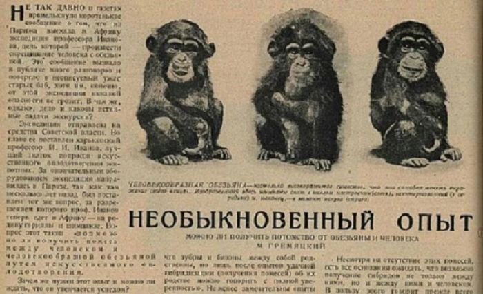 В 1924 году от советского ученого, профессора Ильи Иванова, поступило обращение в Народный комитет просвещения. Ученый, который был знаменит за счет своих интересных работ по межвидовому скрещиванию, просил оказать финансовую помощь для проведения опытов по получению потомства в экспериментах по скрещиванию шимпанзе и человека. Профессор был уверен в успехе, считая, что появление на свет человекообезьяны реально, и тормозит процесс только людское невежество. В 1925 году профессору пришел ответ: проект был одобрен, и на него выделили огромную по тем временам сумму в валюте.