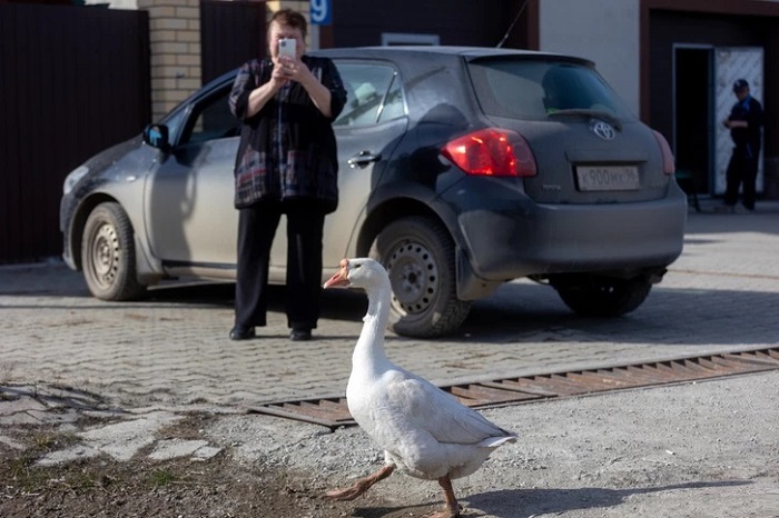 Малыш уверенно перешагивает через ворота дома и шлепает лапами по поселковым улицам. Здесь ему всё знакомо. Соседи, хоть и видят его постоянно, всё равно при встрече достают телефоны и снимают на видео. Гусю, похоже, это не очень нравится. Ощущая внимание, он начинает недовольно гаркать, будто ворчит или жалуется хозяину.