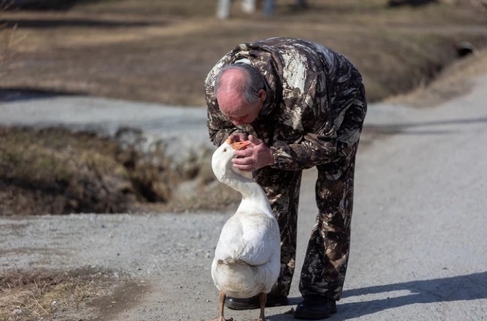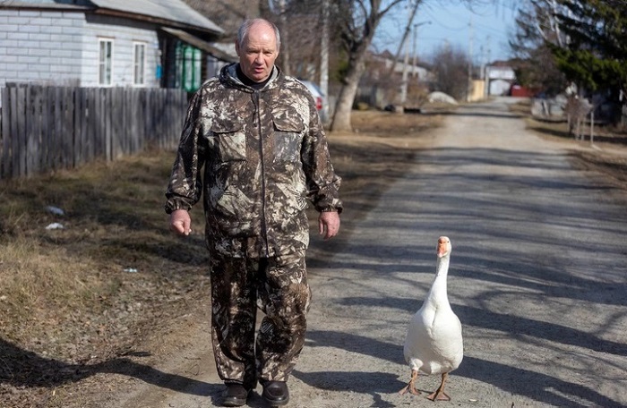 В поселке Большой Исток эту парочку знает каждый: пенсионер Сергей Львович и его гусь постоянно гуляют в местном парке. Птенец по кличке Малыш появился у мужчины два года назад. И с тех пор они неразлучны: вместе ходят в магазин, ездят на рыбалку и по грибы. Гусь выполняет все команды хозяина, хотя специально его никто не дрессировал.
