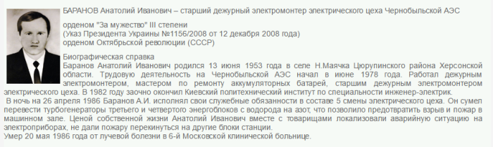 Когда ее уровень возле сливных вентилей Б-Б под блоком №4 упал примерно до 50 см, к ним, по распоряжению начальника реакторного цеха В. Грищенко отправились старшие инженеры А. Ананенко и В. Беспалов. Их сопровождал Б. Баранов, начальник смены станции. Облачённые в гидрокостюмы, с фонарями и разводными ключами в руках, они дошли до вентилей, по маркировке сверили номера. Борис Баранов встал на страховке, а Алексей Ананенко и Валерий Беспалов вручную стали открывать сливные линии. На это ушло около 15-ти минут. Шум сливающейся из нижнего этажа бассейна воды убедил их в достижении нужного результата. Вернувшись после выполнения задачи, они проверили свои дозиметры (им выдали оптические дозиметры ДКП-50, «карандаши» военного образца), на них было по 10 годовых норм.."