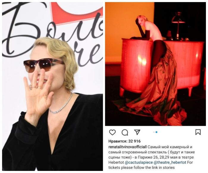 Актриса театра и кино, кинорежиссёр, сценарист Рената Литвинова сейчас живёт в Париже, где она купила квартиру около 8 лет назад. В январе в парижском театре Hebertot состоялась премьера спектакля Литвиновой "Кактус". Очередные показы актрисы анонсировала, разместив в запрещённой соцсети полуобнажённые фотографии.