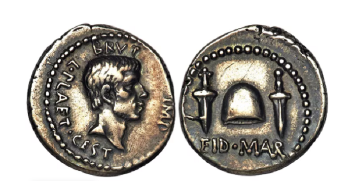 Та монета, о которой идет речь, содержит на аверсе изображение профиля Брута, обращенного вправо, а также буквы BRVT IMP LPLAET CEST. Расшифровываются они так: «Брут император (слово употреблено в значении «командующий»), Луций Плеторий Цестиан (таково было имя казначея Брута). На реверсе изображены кинжалы – те, которыми был убит Гай Юлий Цезарь, а также шапка пилеус, не просто римский головной убор, но символ свободы; такую шапку часто носили освобожденные рабы.