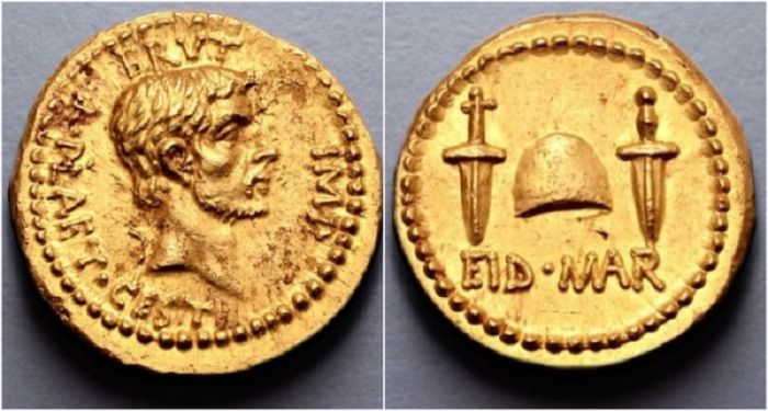 Всего таких монет три, если говорить о тех, о чьем существовании и местонахождении известно специалистам. Серебряных денариев Брута около сотни. Конечно же, отчеканено было значительно больше – эти монеты в 42-43 годах предназначались для расчетов с армией. За пару лет до этого произошло то событие, благодаря которому имя Брута было навечно вписано в историю. В 44 году до н.э., в день 15 марта, который именуется «Мартовские Иды», в результате заговора был убит Гай Юлий Цезарь.