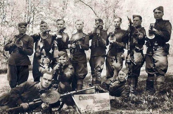 Коллективный снимок действующих бойцов-диверсантов 88-го истребительного батальона УНКВД города Москвы и Московской области — спецшколы подрывников УНКВД города Москвы и Московской области. Осенью 1943 года все они были переведены в состав спецроты Управления войск НКВД по охране тыла Западного фронта, а 6 марта 1944 года большинство из них пополнили собой ряды секретных сотрудников Разведывательного отдела штаба Западного (с 24 апреля 1944 года – 3-го Белорусского) фронта. Многие не вернулись из зафронтовой командировки в Восточную Пруссию.