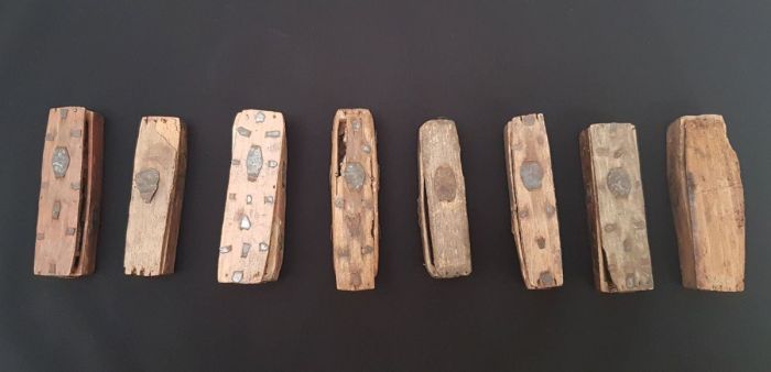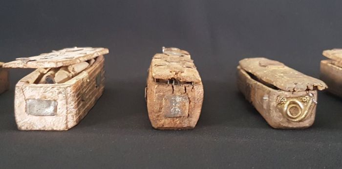 Гробы были поставлены на трех вырубленных в сланце полках, расположенных друг над другом. На двух нижних рядах было по 8 гробов, и еще один возвышался над остальными, уложенный на самую верхнюю полку в одиночестве. Все лежащие внутри фигуры уникальны и предположительно имеют портретное сходство с некими людьми. Они наряжены в аккуратно сшитые (и также уникальные для каждой фигурки) похоронные одежды, что лишь подтверждает, что все они символизируют каких-то определенных личностей.