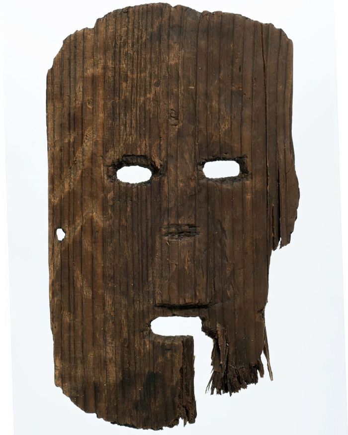 До сего момента было найдено лишь две деревянные маски этого периода. Маска вырезана из кедра, имеет размеры около 30 см в высоту и 18 см в ширину, в ней проделаны отверстия для глаз и рта, а также небольшие дырочки по бокам — видимо, для завязок.