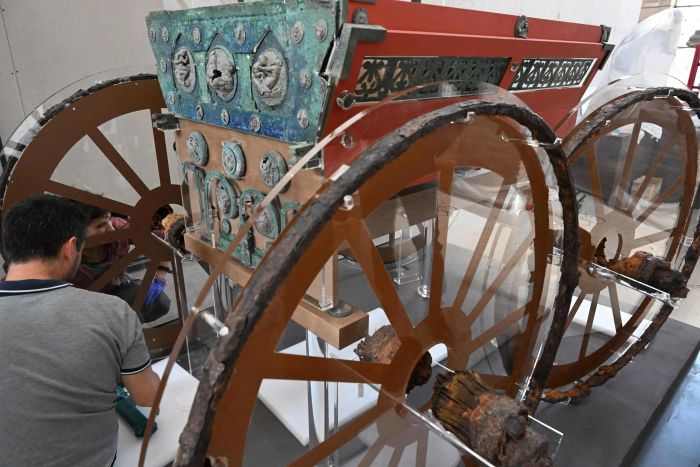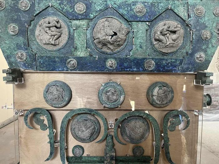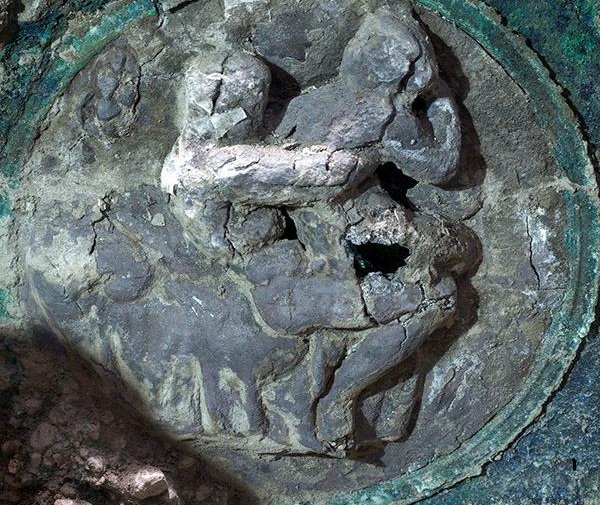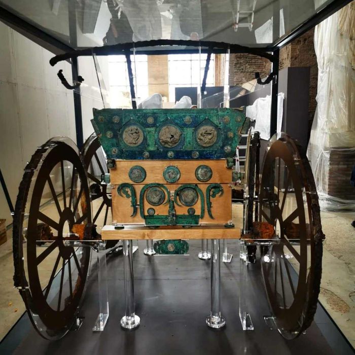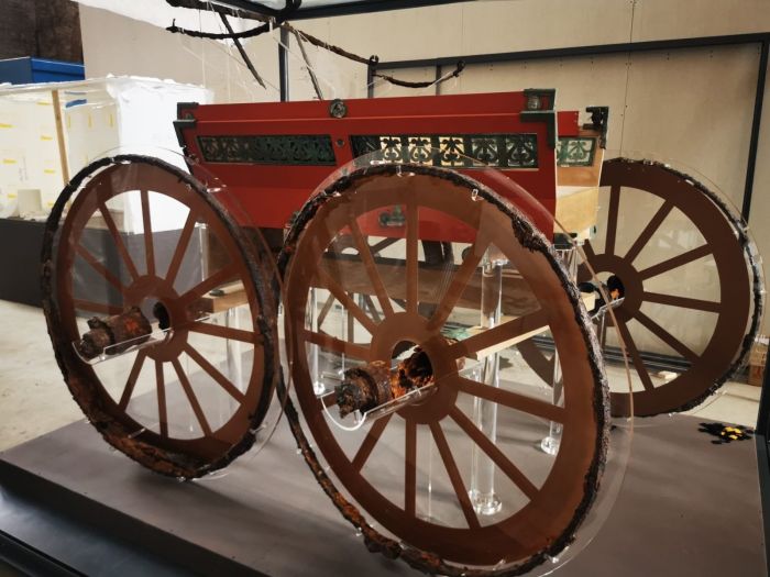 Колесница c четырьмя колесами c железными ободами; с рельефными панелями из бронзы и олова; с элементами из карбонизированного дерева и даже с отпечатками органической фурнитуры и украшений.