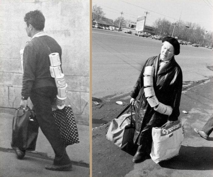Даже когда производство туалетной бумаги было развёрнуто в полном объёме, она оставалась дефицитной продукцией, и если подворачивалась возможность, люди обвешивались связками рулонов, запасаясь на длительный срок. А что? Не портится же.