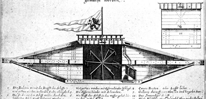 В 17 веке такой катер-таран был настоящим прорывом. Французский изобретатель Жан Десон решил построить такой корабль в период войны 1652-1654 (англо-голландская). Такое мощное судно должно было стать преимуществом голландского войска и переломить ход войны в свою пользу.