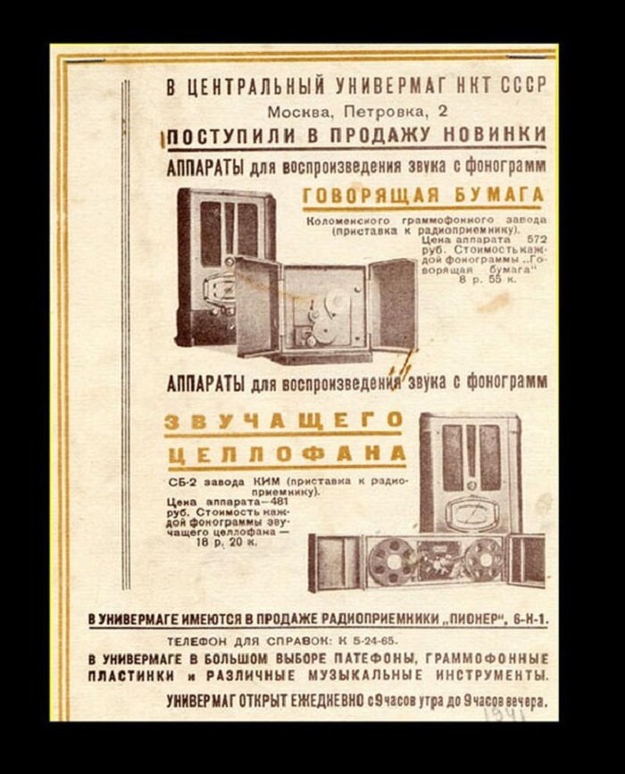 Начались эксперименты, которые дали хорошие результаты. Бумажная лента почти не изнашивалась при многократном прослушивании, была дешевой и гораздо менее дефицитной, чем импортный шеллак, из которого тогда делали пластинки. Запись на ленте легко монтировать с помощью ножниц и клея. А главное, сделанную запись можно было размножить полиграфическим способом в любой типографии без малейшей потери качества.