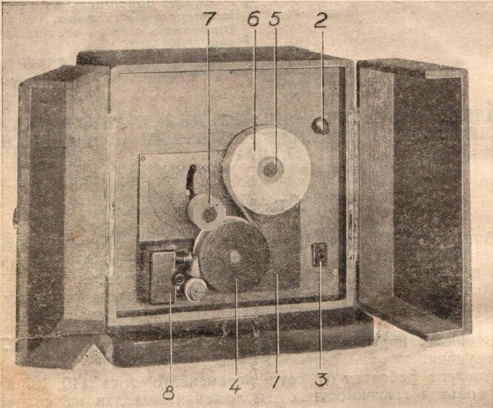 Лентопротяжный механизм аппарата приводится в движение синхронно-асинхронным реверсивным мотором с вмонтированным в него редуктором. Мотор расположен внутри ящика аппарата. Потребляемая мощность его около 35−40 ватт.