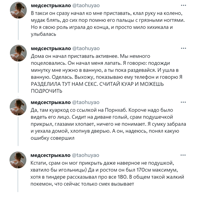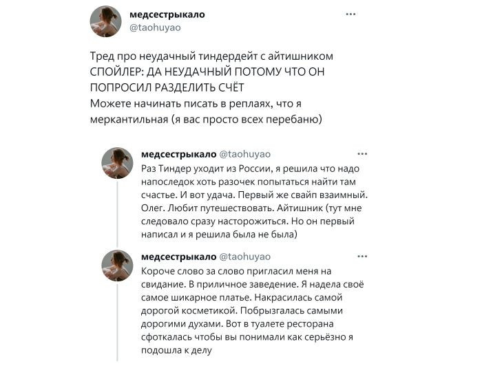 Пользовательница Твиттера, узнав, что приложение знакомств доживает в России последние дни, решила сходить на свидание с парнем из "Тиндера". Встреча её разочаровала, и недовольная девушка подробно рассказала, чем её не устроил кавалер.