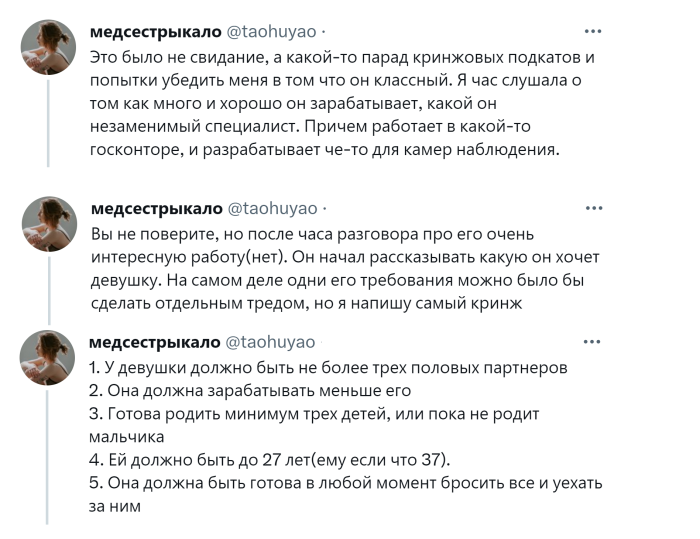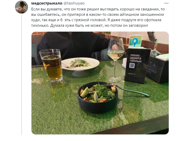 Свидание с человеком, которого никогда не видел - всегда сюрприз, и довольно часто ожидание не соответствует реальности. Пользовательница Твиттера поделилась своей историей о встрече с айтишником, который, казалось бы, идеально ей подходил. По крайней мере, в плане интересов и финансового положения: парень любит путешествовать, работает в сфере IT. Казалось бы, что может пойти не так? Как выяснилось - практически всё.