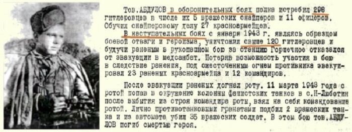 За свой короткий боевой путь Иван Абдулов не только мастерски истреблял врага сотнями, но и лично обучил снайперскому мастерству три десятка учеников. Академические источники обычно указывают результат ефрейтора в 298 фашиста. Но эта цифра касается только оборонительных боев. Участвовал Абдулов и в наступательной операции, где количество убитых врагов не фиксировалось. По свидетельству сослуживцев, снайпер Иван округлил это число до 500. Не бездействовал и его младший брат Кирилл. В одной из заметок «Сибирского родника» сказано, что на его счету еще 114 фашистов.