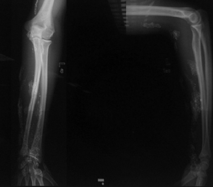 Рентгеновский снимок (переднезадний и боковой виды), показывающий множественные подкожные отложения рентгеноопаски