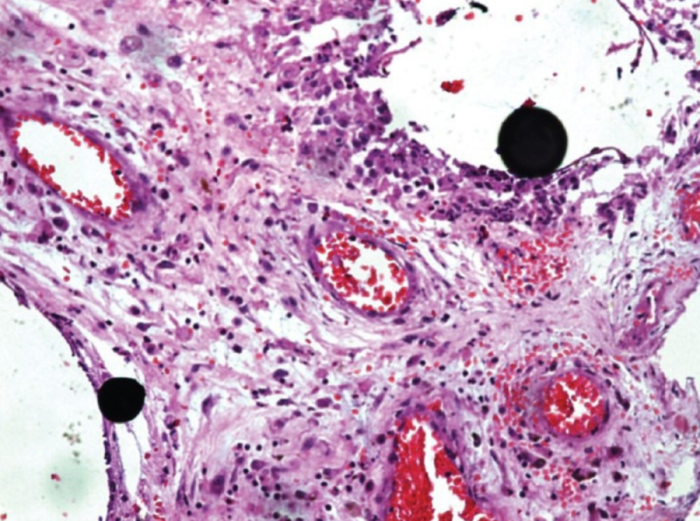Окрашенный гематоксилином и эозином срез (× 10), показывающий капли ртути в кистозных пространствах, окруженных клетками хронического воспаления
