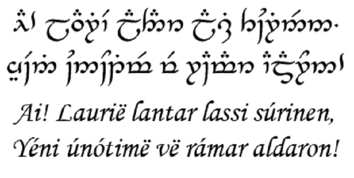 Пример эльфийского письма (тенгвар) и его транслитерации латиницей