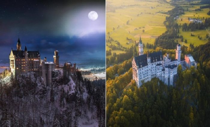 Нойшванштайн был возведен над ущельем Пеллат в Баварских Альпах недалеко от Фюссена – в месте, где до него располагались два маленьких и к моменту строительства уже полуразрушенных старых замка. Их развалины расчистили к 1868 году, а первый камень в фундамент замка для короля заложили год спустя.