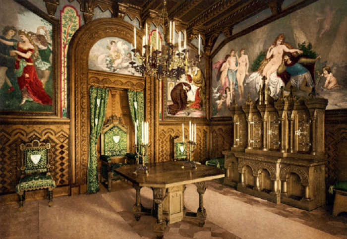Нойшванштайн выполнен в стиле средневекового тевтонизма, на что короля вдохновила опера Рихарда Вагнера «Тангейзер». Поскольку король Людовик был поклонником этого небезызвестного композитора и даже покровительствовал ему, стены в замке он приказал украсить изображениями сцен из легенд, которые вдохновили Вагнера на написание произведений. Так, например, в рабочем кабинете монарха можно увидеть «Сагу о Тангейзере», а в гостиной – сцену из «Лоэнгрина».