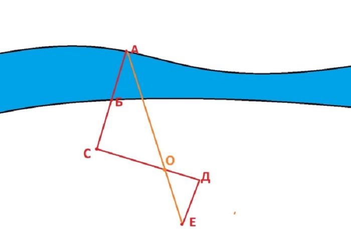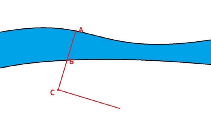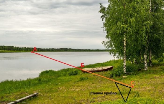 Сначала выбираем две наиболее приметные точки на берегах «А» и «Б», после чего ставим колышек в точку «С», которая должна лежать с точками «А» и «Б» в одной прямой линии на любом удалении от берега. От колышка делаем 10 шагов к следующей точке «О» так, чтобы наше движение чертило перпендикулярную линию отрезку «АС». Ставим на месте «О» еще один колышек.