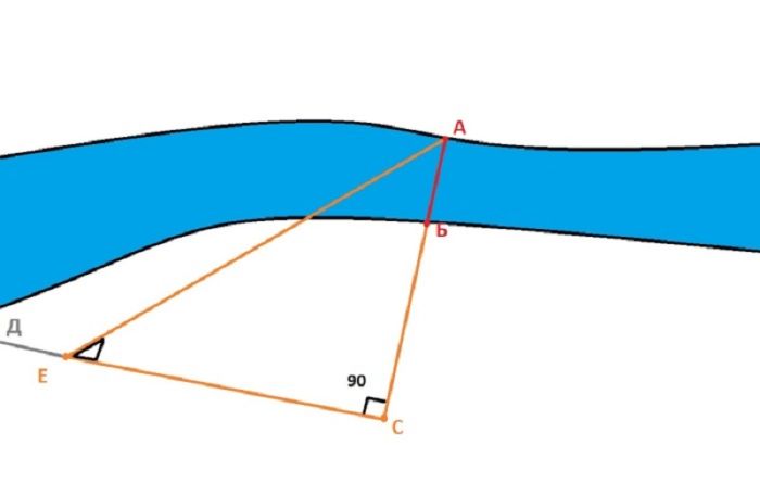 Таким образом отрезок «АС» будет равен 5 отрезкам «ДЕ». А так как расстояние от точки «Б» до точки «С» мы знаем, то можно вычесть из отрезков ширину реки.