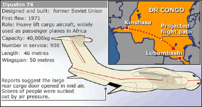 Примерно через 45 минут после вылета из Киншасы, на высоте 7000 метров (по другим данным 3000 метров), грузовой люк Ил-76 внезапно открылся и многих пассажиров вытянуло наружу. Выжившие описывали происходившее как хаос. Пассажиры кричали и вылетали из открытого люка. Кто-то успел вцепитьтся в веревки и в сетку на внутренней стороне самолета. Выжившие также утверждали, что самолет внезапно накренился влево, а затем вправо, что привело к тому, что еще больше людей было вытянуто наружу. Закрепленный в грузовом отсеке грузовик послужил барьером между открытым задним люком и остальным отсеком, что спасло множество жизней.