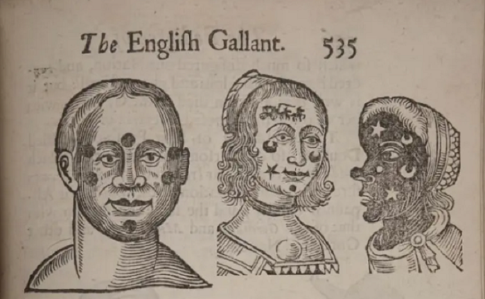 Подобные декоративные «наклейки» носили на лице еще в римские времена. В середине XVII столетия многие английские дамы забавлялись с такими мушками из черного шелка или бархата, придавая им разные очертания. Кроме того, как раз на пике моды тогда были лифы с глубоким вырезом и открытыми плечами, жемчужные ожерелья и серьги, волосы, по бокам свободно спадавшие волнами до плеч, а сзади собранные на затылке. Все это – но прежде всего мушки – могло тогда восприниматься частью общества как распущенность.