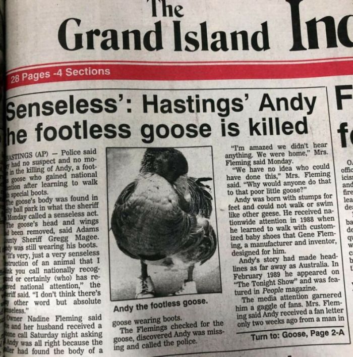 К сожалению, 19 октября 1991 года произошло непоправимое. Какие-то мерзавцы выкрали знаменитого гуся в кедах прямо из дома Флеминга. Вскоре птицу нашли мертвой неподалеку, возле пруда. Садисты убили птицу, оторвав ей голову и крылья. Это преступление стало резонансным, и его начала расследовать полиция.