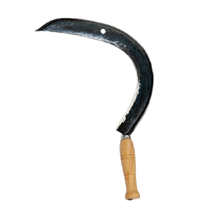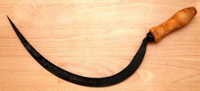Есть версия, что художник рисовал серп с натуры, а для этой цели ему предоставили первый попавшийся экземпляр, который уже не мог пригодиться в хозяйстве и его не жалко было отдать. А рукоятка там для каких то целей была переставлена.