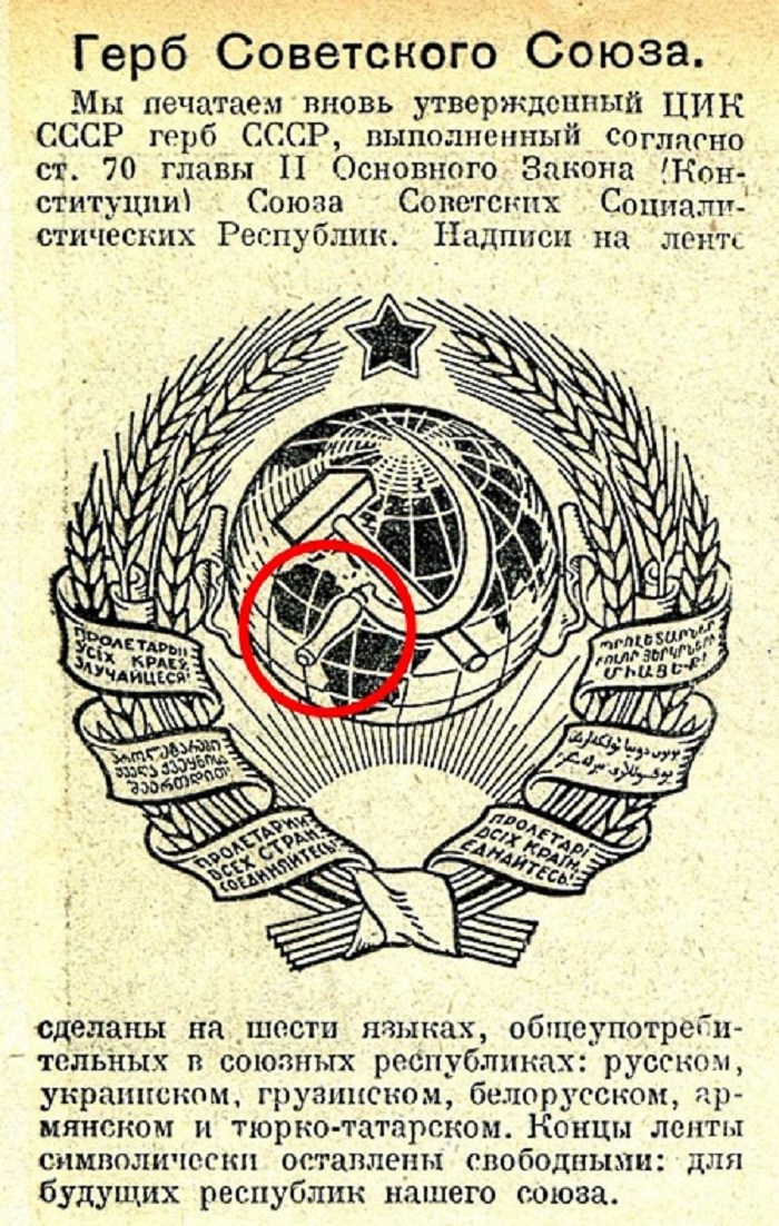 В интернете можно найти такой "интересный факт", который сообщает, что первый герб СССР, утвержденный 6 июля 1923 года, был нарисован с вопиющей ошибкой! Удивительно, но ни сам художник, ни члены ЦИК не смогли этого вовремя заметить. Эту ошибку никто не замечал целых 14 лет!