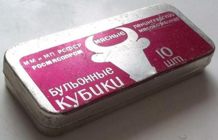 В СССР бульонные кубики полностью соответствовали названию, то есть имели строгую кубическую форму. Состав радовал: этот продукт готовили из натуральных ингредиентов отличного качества. Мясные кубики, например, делали из крепчайшего мясного бульона, для куриных брали куриный бульон, растительные содержали овощной экстракт. Добавки заменяли сахаром, солью, мускатным орехом и крахмалом. Кроме бульона в ход шел жир (говяжий, с ароматными эфирными маслами). Весили кубики около 4 г. После того как они были готовы, их помещали в фольгу, которая для соблюдения условий хранения имела слой пергамента. Упаковка заклеивалась ленточкой, кубики помещались в удобные жестяные банки. Такие коробочки и поныне стоят у многих на балконе — люди хранят в них гвозди, болты и прочие мелочи.