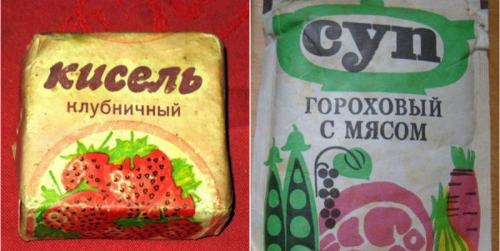 Еще один популярный полуфабрикат, который начали производить для армии, это кисели в брикетах. Такой напиток подавали в рабочих столовых, в школах и даже в детских садах. Люди делали и дома кисели, благо и делать особо ничего не надо было — раскрошить брикет на мелкие кусочки, залить водой и варить 20 минут. Все, вкусное блюдо готово. А дети обожали грызть брикетики сухого киселя. Он был действительно вкусным и стоил очень дешево. Натуральные кисели продаются и сегодня. В большинстве случаев состав хороший — высушенные фрукты и ягоды, сахар и крахмал. Бывает, что производители добавляют синтетические ароматизаторы. Надо внимательно просматривать этикетку перед покупкой.