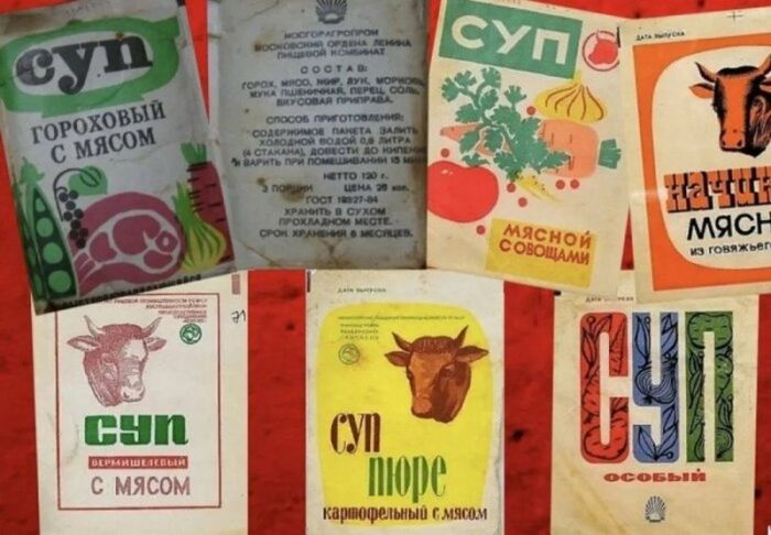 Большой популярностью пользовались концентрированные супы в пакетиках. Их можно было приготовить буквально за несколько минут. Иногда люди добавляли в суп порезанную колбаску или тушенку. Получалось очень сытное первое блюдо. Детям очень нравились супчики, в которых присутствовали продукты, имеющие забавные формы. Это могли быть звездочки и кружочки из теста, морковь кубиками, небольшие цилиндрики высушенного мяса. Супов было очень много и все разные: с мясом и копченостями, с бобовыми, с макаронами, а также молочные и овощные. И кстати, все они были весьма вкусными.