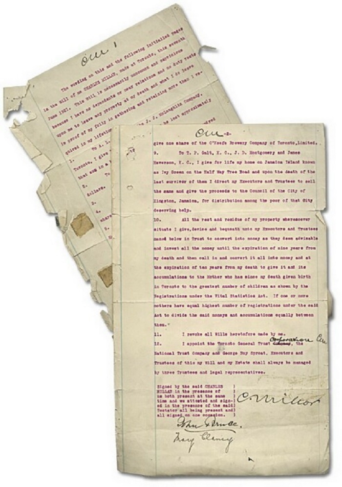 Акции жокейского клуба Миллар разделил между людьми, которые яро стремились закрыть лошадиные бега и ратовали за ликвидацию любых тотализаторов. Таким образом они были вынуждены стать членами клуба, чтобы избавиться от ценных бумаг. По единственной акции еще одного клуба мужчина отписал практикующим священникам. Правда, общество являлось полным банкротом, и цена «наследства» каждого составила пол цента. Еще по одной акции пивзавода O'Keefe Чарльз завещал каждому священникам-протестантам. Шутка заключалась в том, что тот завод принадлежал их врагам католикам, что в итоге вылилось в конфликтные религиозные разборки. Со своим богатым домом на Ямайке Миллар поступил еще изощреннее: он передал его во владение трем приятелям, ненавидящим друг друга. И лишил их права продажи. Сбыть имение можно было только после смерти всех троих, а вырученные деньги должны были передаться местным беднякам.