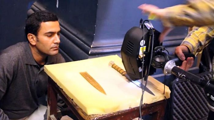 Ученые в 2016 году провели анализ материала и выяснили точный хим. состав и доказали, что железо клинка имеет 100% метеоритное происхождение (который упал в районе Ближнего Востока).