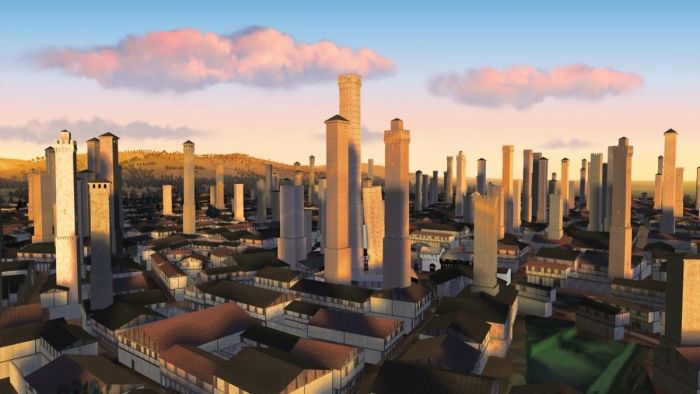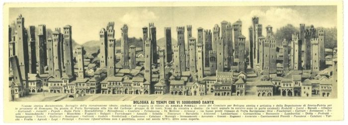 Болонья — город башен. Они являются одной из главных достопримечательностей города. К сожалению, до нынешнего времени сохранилось не так уж много башен. А вот в Средневековье город представлял себе настоящий лес из башен, и выглядел примерно вот так: