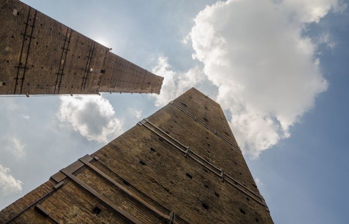 Нужно сказать, что для средневекового города с его ограниченными ресурсами строительство башен было делом совершенно непростым. На строительство башни высотой в 60 метров обычно уходило от 3 до 10 лет. При этом на строительстве в основном были задействованы рабы и военнопленные. Есть версия, что главные башни Болоньи – “Две башни” – с самого начала они были построены под наклоном, поэтому их в народе называют еще и падающими башнями. По другой версии это все же дефект строительства. Расположены башни были в самом центре средневековой Болоньи, в том месте, где пересекались все дороги от городских ворот.